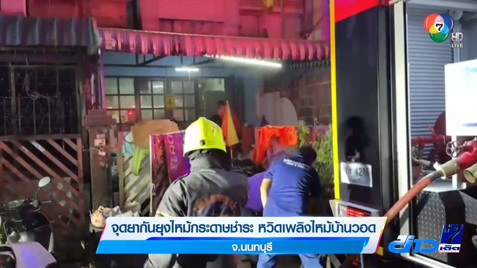 ข่าวเด็ด 7 สี - อาสากู้ภัยและเจ้าหน้าที่ดับเพลิงกำลังเร่งระบายกลุ่มควันที่คละคลุ้งอยู่ภายในบ้านหลังหนึ่ง ซึ่งเป็นตึกแถว 3 ชั้น ในซอยเรวดี 62 ตำบลตลาดขวัญ พื้นที่ตัวเมืองนนทบุรี ภายหลังเกิดเหตุเพลิงไหม้กระดาษชำระม้วนใหญ่ที่อยู่ภายในห้องนอนชั้น 3 ของตัวบ้าน