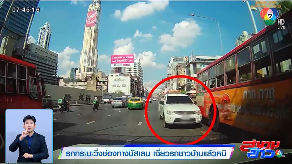 นี่เป็นภาพจากกล้องหน้ารถยนต์ของผู้เสียหายที่ขับรถมาตามถนนราชปรารภ หลังออกตัวจากไฟแดงแยกประตูน้ำก็ขับมาตามทางปกติ แต่ถนนเส้นนี้เป็นทางบังคับให้เดินรถทางเดียว จำนวน 5 ช่องทาง และมีบัสเลนให้รถประจำทาง 1 ช่องทาง แต่ปรากฏว่ารถกระบะสีขาวโผล่มาหลังรถเมล์เพื่อจะแซง แต่เหมือนรู้ตัวว่าวิ่งทางผิด พยายามจะเบี่ยงเข้า จังหวะนั้นทำให้รถกระบะเฉี่ยวรถของตน แต่ตำรวจบอกกล้องไม่ชัด อยากถามว่าดูหรือยัง จริง ๆ ป้ายทะเบียนชัดมาก แต่เราต้องเบลอภาพไว้ก่อน ให้ตำรวจไปตรวจสอบว่ามีความผิดไหม เขาบอกว่าแม้รถเสียหายไม่มาก แต่วันที่เกิดเหตุในรถมีคุณแม่อายุ 60 กว่า และลูกอายุ 3 ขวบ ต่างรู้สึกตกใจ และที่สำคัญไม่อยากปล่อยให้คนที่ทำผิดลอยนวล รวมถึงอยากให้ตำรวจเข้มงวดกับการดูแลการจราจรด้วย
