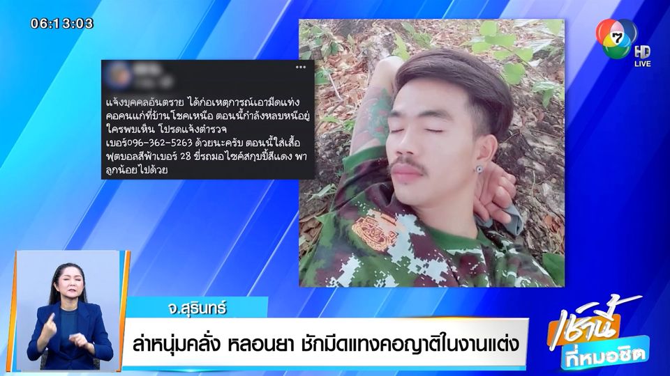เช้านี้ที่หมอชิต - หนุ่มหลอนยาคลั่ง ชักมีดแทงคอญาติในงานแต่งงานบาดเจ็บเย็บ 4 เข็ม หลังก่อเหตุชิงรถจักรยานยนต์พาลูก 7 ขวบหลบหนีไป