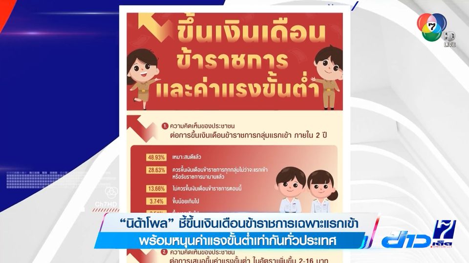 ข่าวเด็ด 7 สี - สถาบันบัณฑิตพัฒนบริหารศาสตร์ หรือ นิด้าโพล เผยผลสำรวจประชาชนกว่า 1,310 ตัวอย่าง เรื่อง "ขึ้นเงินเดือนข้าราชการ และค่าแรงขั้นต่ำ" 2566