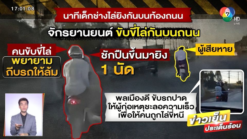 ข่าวเย็นประเด็นร้อน - เกิดเหตุการณ์ระทึกกลางถนน เมื่อเด็กนักเรียนช่างกลุ่มหนึ่ง ขับขี่รถจักรยานยนต์ ไล่ยิง 2 นักเรียนช่างบนท้องถนนในอำเภอเมืองฉะเชิงเทรา ซึ่งจังหวะนั้น มีหนุ่มพลเมืองดีขับรถตามหลัง ใช้โทรศัพท์มือถือบันทึกภาพเหตุการณ์ไว้ได้ และพยายามหาวิธีช่วยนักเรียนช่างที่ถูกไล่ยิง
