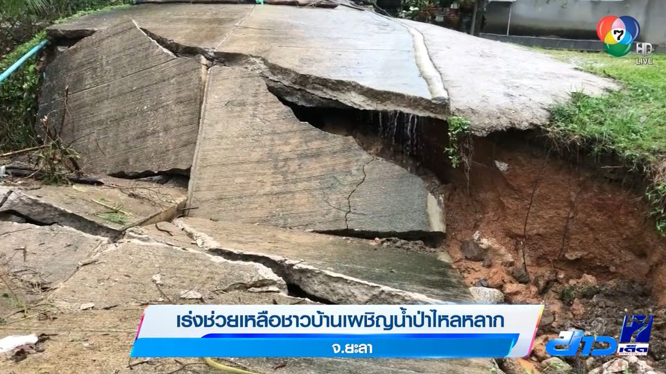 ข่าวเด็ด 7 สี - โดยฝนที่ตกลงมาอย่างหนักต้ดต่อกัน 2-3 วัน ทำให้พื้นที่จังหวัดชายแดนภาคใต้หลายพื้นที่ มีน้ำท่วม น้ำป่าไหลหลาก และมีดินไหล อย่างพื้นที่หมู่ 2 และ หมู่ 6 บ้านกือลอง ตำบลตลิ่งชัน อำเภอบันนังสตา จังหวัดยะลา มีน้ำป่าไหลหลากจากเทือกเขาปกโย๊ะ ทำให้กระแสน้ำป่ากัดเซาะถนน เส้นทางระหว่างบ้านกือลอง หมู่ 2 ซึ่งเป็นเส้นทางเบี่ยง ใช้สัญจรชั่วคราว เนื่องจากกำลังทำการซ่อมแซมสะพานข้ามคลองที่ชำรุดเสียหาย