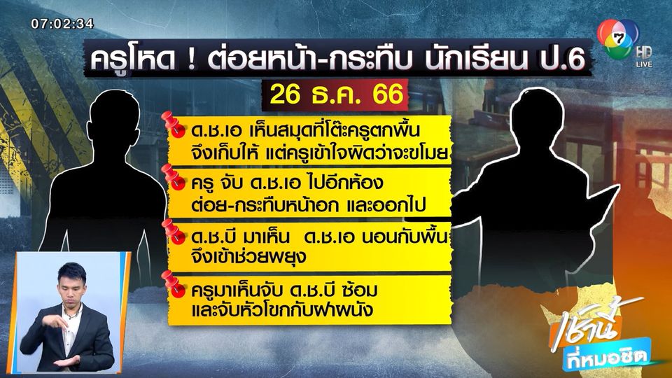 เช้านี้ที่หมอชิต - ที่จังหวัดลพบุรี เกิดกรณีครูโรงเรียนเอกชนแห่งหนึ่ง แสดงพฤติกรรมอำมหิต ต่อยหน้า-กระทืบหน้าอกเด็ก ป.6 จนซี่โครงหัก ลงไปนอนบนพื้นลุกไม่ไหว เพื่อนมาเห็นเข้าไปช่วยพยุง กลับถูกจับหัวโขกผนังไปอีกคน ผู้บริหารโรงเรียนแฉ ก่อเหตุมาแล้วหลายครั้ง เคยคาดโทษไว้ ครั้งนี้ต้องไล่ออกสถานเดียว