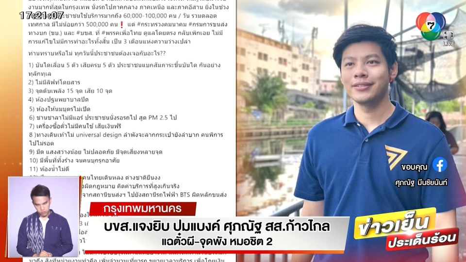 ข่าวเย็นประเด็นร้อน - หลังจากที่ "สส.แบงค์ ศุภณัฐ" สส.พรรคก้าวไกล กรุงเทพฯ โพสต์แฉและทวงถามถึงความปลอดภัยพื้นฐานในสถานีขนส่ง "หมอชิต 2" ซึ่งมีถึง 14 จุดที่ไม่ปลอดภัย ล่าสุดวันนี้ บขส. ออกมาชี้แจงแล้ว
