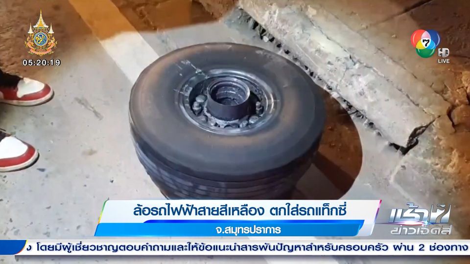 เช้าข่าว 7 สี - ล้อรถไฟฟ้าสายเหลือตกใส่รถแท็กซี่ ที่วิ่งอยู่ด้านล่างได้รับความเสียหาย