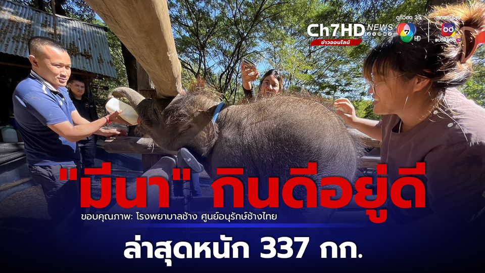 สัตว์แพทย์พาลูกช้างป่า “น้องมีนา” ชั่งน้ำหนักได้ 337 กิโลกรัม ที่ตัวล้น ๆ ไม่แน่ใจเป็นเพราะตัวใหญ่หรือตาชั่งอันเล็ก