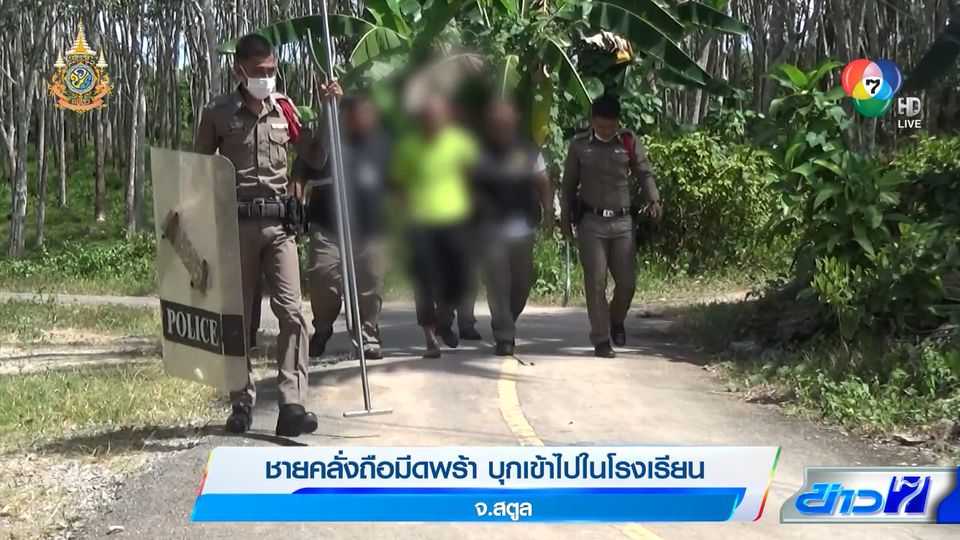 ข่าวภาคค่ำ - ชายคลั่งถือมีดพร้าบุกเข้าไปในโรงเรียนที่จังหวัดสตูล ขณะที่ครู นักเรียน กำลังช่วยกันจัดเตรียมงานวันเด็กแห่งชาติ ทำให้ต่างตกใจกลัว วิ่งหนีเข้าไปซ่อนในห้องเนรียน ก่อนที่จะแจ้งตำรวจเข้ามาล็อกตัวไว้ได้