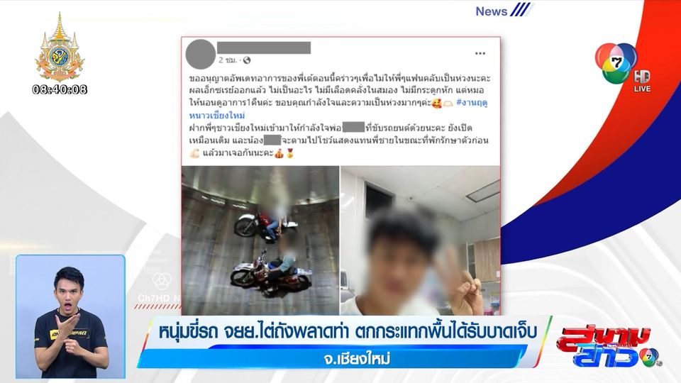 สนามข่าว 7 สี - เหตุการณ์ที่จะนำเสนอต่อไปนี้ ต้องบอกว่าอุบัติเหตุสามารเกิดขึ้นได้ตลอดเวลา เมื่อหนุ่มคนหนึ่ง นักแสดงรถจักรยานยนต์ไต่ถัง ภายในงานของดีเมืองเชียงใหม่ จังหวัดเชียงใหม่ จู่ ๆ เกิดผิดพลาดทางเทคนิค ทั้งคนและรถหล่นจากขอบถังลงพื้นอย่างแรงจนได้รับบาดเจ็บ