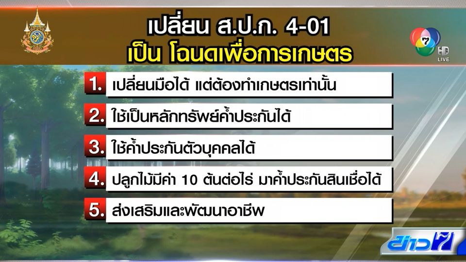 ข่าวภาคค่ำ - รัฐบาลเดินหน้านโยบายสนับสนุนที่ดินทำกินให้เกษตรกรทั้งประเทศ โดยเปลี่ยนที่ดิน ส.ป.ก. 4-01 เป็นโฉนดเพื่อการเกษตร Kick off พรุ่งนี้ มอบเกษตรกร 25,000 คนทั่วประเทศ