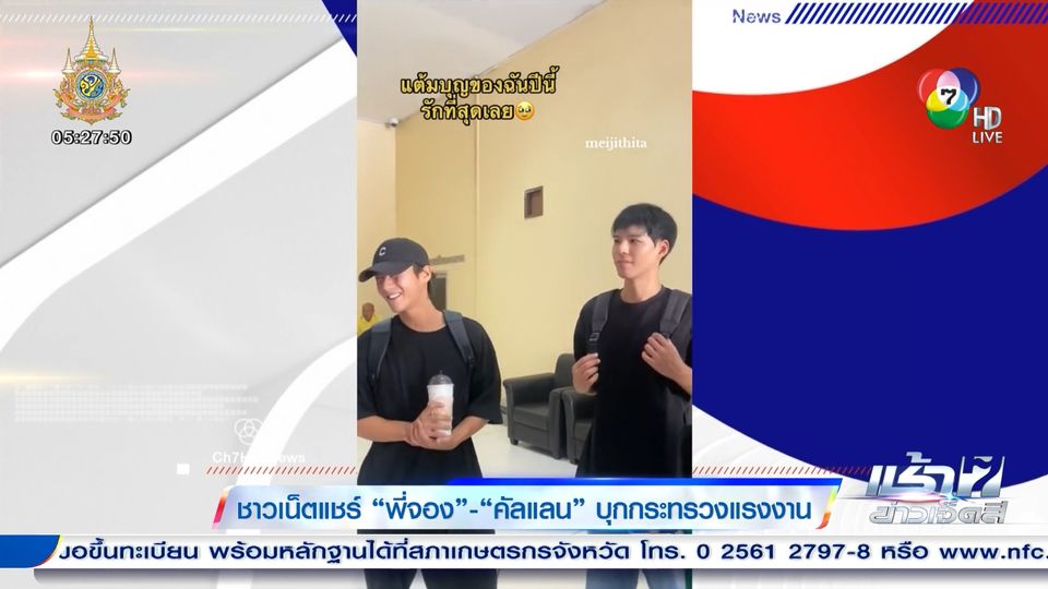 เช้าข่าว 7 สี - ชาวเน็ตแชร์คลิป พี่จองและคัลแลน 2 หนุ่ม YOUTUBER สุดฮอตใน พ.ศ.นี้ บุกไปที่กระทรวงแรงงาน สาว ๆ กรี๊ดกันยกใหญ่ ทีมข่าวสอบถามไปที่กระทรวงฯ ทราบมาว่า 2 หนุ่ม ติดต่อเกี่ยวกับเรื่องใบอนุญาตทำงาน