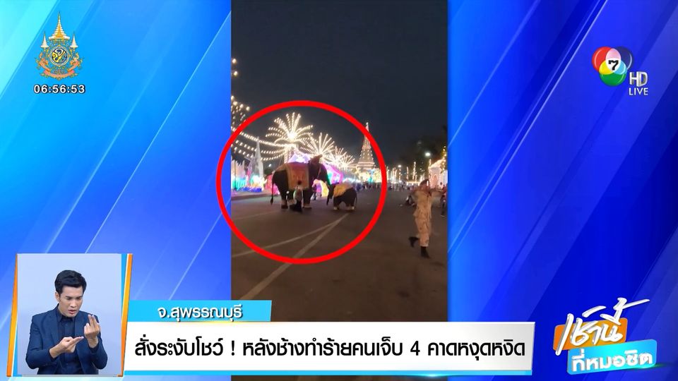 เช้านี้ที่หมอชิต - ผู้ว่าสุพรรณฯ แจง เหตุช้างโชว์งานอนุสรณ์ดอนเจดีย์ ทำร้ายนักท่องเที่ยวเจ็บ 4 ราย มาจากอาการโมโหหงุดหงิด ช้างพี่หวงช้างน้อง ไม่ได้ตกมัน สั่งระงับโชว์หน้างานแล้ว โดย "เจ้าก้านกล้วย" จะถูกส่งตัวกลับสุรินทร์