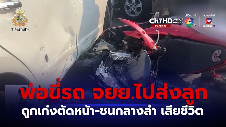 พ่อขี่ จยย.ไปส่งลูก ถูกรถเก๋งตัดหน้า-ชนกลางลำ เสียชีวิต