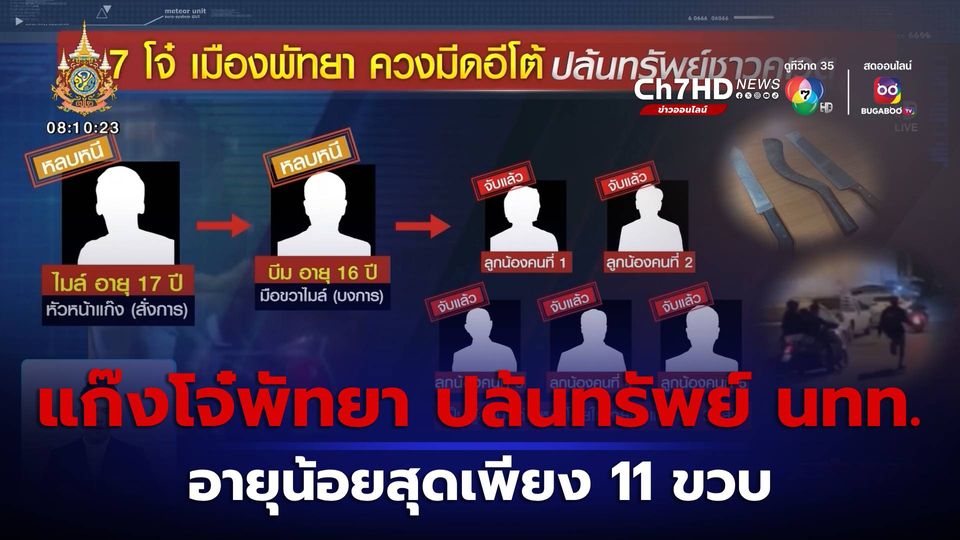 สนามข่าว 7 สี - ตำรวจ สภ.เมืองพัทยา ได้รับแจ้งจากนักท่องเที่ยวชาวคูเวต ว่าถูกกลุ่มวัยรุ่น ใช้อาวุธมีดข่มขจู่ดักปล้นกลางดึกเมื่อคืนที่ผ่านมา พบผู้ก่อเหตุอายุน้อยที่สุดเพียง 11 ขวบ มีคลิป เห็นแล้วตกใจมากไม่น่าเชื่อว่านี่เป็นฝีมือของวัยรุ่นอายุ 10 กว่าปี