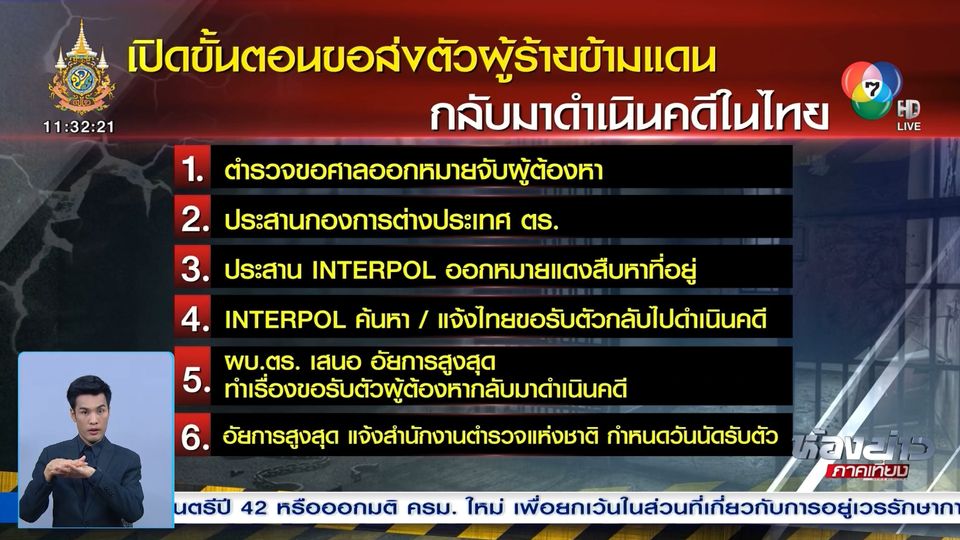สำหรับขั้นตอนการขอตัวผู้ร้ายข้ามแดน ส่งตัวกลับมาดำเนินคดีในไทย ตามกระบวนการจะเริ่มจาก พนักงานสอบสวนเจ้าของคดี รวบรวมพยานหลักฐานที่ชี้ได้ว่าผู้ต้องหาหลบหนีไปต่างประเทศ ไปขอศาลออกหมายจับผู้ต้องหา จากนั้นจึงประสานผ่านไปทาง กองการต่างประเทศ สำนักงานตำรวจแห่งชาติ ให้ช่วยประสานตำรวจอินเทอโพล หรือตำรวจสากล พิจารณาออกหมายแดง แจกจ่ายไปยังตำรวจสากลที่มีประเทศสมาชิกอยู่ 190 ประเทศ ให้ช่วยออกตามหาผู้ต้องหา หากเจอตัวแล้ว และเป็นประเทศที่มีสนธิสัญญาส่งตัวผู้ร้ายข้ามแดน ตามปกติจะมีการประสานทางการประเทศนั้น ๆ ให้ช่วยควบคุมตัว และแจ้งทางการไทยให้ติดต่อขอรับตัวกลับไปดำเนินคดี ซึ่งผู้บัญชาการตำรวจแห่งชาติ จะเป็นผู้ลงนามหนังสือประสานกับสำนักงานอัยการสูงสุด ให้ทำเรื่องขอรับตัวผู้ต้องหา จากนั้น อัยการสูงสุดจะแจ้งกลับมายังสำนักงานตำรวจแห่งชาติ เพื่อกำหนดวันรับตัวผู้ต้องหาอีกที