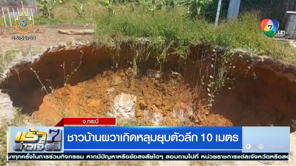 เช้าข่าว 7 สี - เกิดเหตุหลุมยุบตัวกลางชุมชนอ่าวลึกใต้ รัศมีกว้างกว่า 10 เมตร ลึก 10 เมตร ชาวบ้านเห็นแล้วผวา ไม่รู้ว่าเป็นหลุมอะไร ชาวบ้านที่อยู่ใกล้เคียงต้องย้ายออกก่อน เพื่อความปลอดภัย
