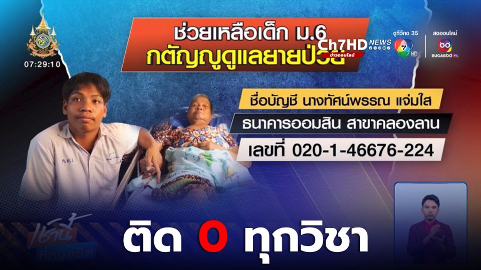 เช้านี้ที่หมอชิต - วอนสังคมช่วยนักเรียน ม.6 สุดกตัญญู ดูแลยายป่วยหนักนานกว่า 2 เดือน จนผลการเรียนติดเกรด 0 ถึง 15 วิชา ชาวบ้านสงสารช่วยหุงหาอาหารทุกวัน ครูเผยเป็นเด็กเรียนค่อนข้างดี ความประพฤติดี แต่มีปัญหาทางครอบครัว
