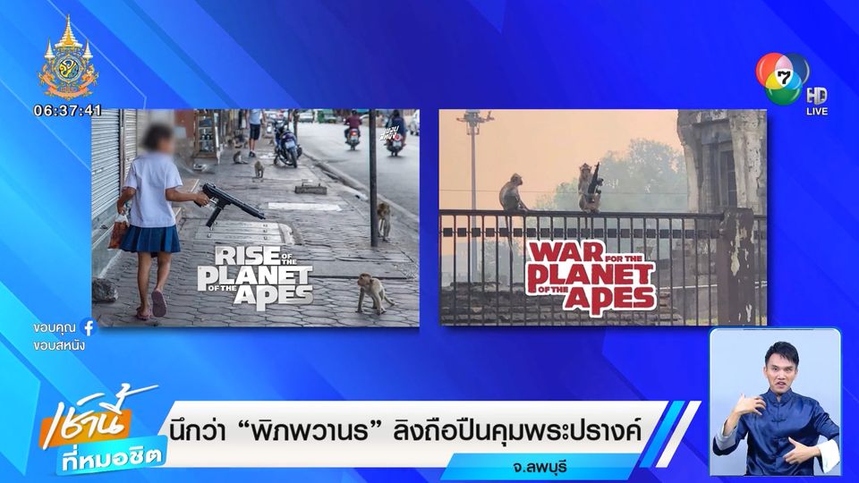 เช้านี้ที่หมอชิต - หลังก่อนหน้านี้มีภาพนักเรียนหญิงถือปืนปลอมขู่ลิง จนเป็นที่ฮือฮาเป็นไวรัลไปทั่วโลก ล่าสุด ฮือฮาอีก เมื่อมีการแชร์ภาพลิงถือปืนนั่งบนรั้วพระปรางค์สามยอด