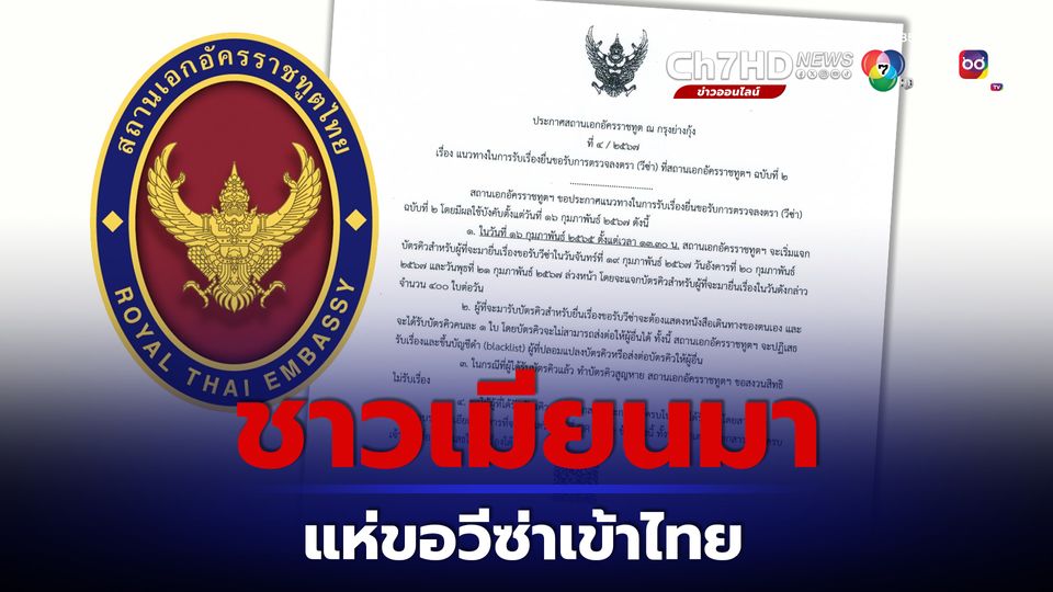 ช่วงค่ำวานนี้ (16ก.พ.67) สถานเอกอัครราชทูต ณ กรุงย่างกุ้ง ได้ออกประกาศแจ้งผ่านทางเฟซบุ๊ก ระบุว่า ตามที่ได้ทำการแจกบัตรคิว เพื่อยื่นขอวีซ่าสำหรับวันจันทร์ที่ 19-21ก.พ.67 วันละ 400 คิวนั้น ขณะนี้ คิวได้ครบเต็มจำนวนแล้ว ดังนั้น ในวันที่ 19-20 ก.พ.นี้ สถานเอกอัครราชทูตฯ จะไม่แจกบัตรคิว เพื่อยื่นขอวีซ่า ที่บริเวณหน้าสถานเอกอัครราชทูตฯ และ จะเปิดให้เฉพาะผูัที่ได้รับบัตรคิวแล้วเท่านั้น มายื่นขอวีซ่าได้ ตามวันและรายละเอียดของบัตรคิวที่ได้รับ
