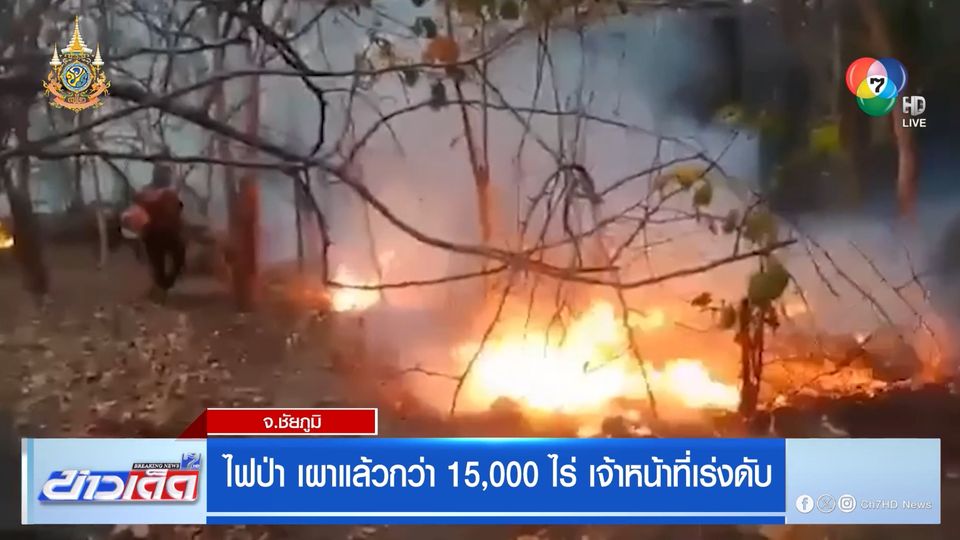 ข่าวเด็ด 7 สี - สถานการณ์ไฟไหม้ป่าในจังหวัดชัยภูมิ ล่าสุดวันนี้ (17ก.พ.) ครอบคลุมพื้นที่กว่า 15,000 ไร่แล้วใน 4 อำเภอ คือ หนองบัวแดง คอนสาร เกษตรสมบูรณ์และภูเขียว ซึ่งอยู่ในเขตรักษาพันธุ์สัตว์ป่าภูเขียวและเขตอนุรักษ์พื้นที่ป่าไม้ต่าง ๆ ส่วนใหญ่เกิดจากปัญหาไฟลามทุ่ง ไฟไหม้ไร่อ้อยของชาวบ้านที่ลุกลามต่อเนื่องไปตามป่าเขาต่าง ๆ เพื่อหวังเข้าไปหาของป่าทำให้เกิดความเดือดร้อนในชุมชน โดยเฉพาะพื้นที่ตำบลนางแดด อำเภอหนองบัวแดง พบเกิดไฟป่าหนักสุดจนถึงขั้นวิกฤติ ส่งผลให้มีกลุ่มควันหนาแน่นบนท้องฟ้ากระจายไปทั่วบริเวณระยะทางไกลกว่า 150 กิโลเมตร ส่งผลกระทบต่อค่าฝุ่น PM 2.5 มีการนำเฮลิคอปเตอร์บรรทุกน้ำขึ้นไปดับไฟป่าตลอดทั้งวันของวันนี้ ควบคู่กับการเดินเท้าของเจ้าหน้าที่และอาสาสมัครดับไฟป่ากว่า 100 นาย