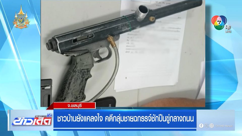 ข่าวเด็ด 7 สี - ความคืบหน้ากรณีชาวบ้านที่อำเภอบางละมุง จังหวัดชลบุรี ผวาหนัก หลังมีกลุ่มชายฉกรรจ์ ขับรถเก๋งสีน้ำเงิน ชักปืนออกมาข่มขู่ เหตุเกิดช่วงค่ำวันที่ 14 กุมภาพันธ์ที่ผ่านมา จากนั้นก็ผู้ก่อเหตุก็ยังคงขับรถมาวนเวียนเบิ้นเครื่องยนต์ เชิงข่มขู่ชาวบ้านอีกหลายครั้ง