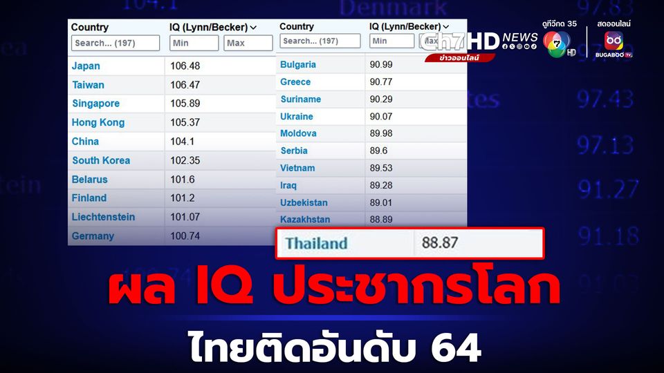 worldpopulationreview เปิดผลผลสำรวจการจัดอันดับ IQ ของประชากรทั่วโลก ประเทศไทยติดอันดับ 64 อันดับ 5 ของอาเซียน ตามหลัง สิงคโปร์ , กัมพูชา , เมียนมา และเวียดนาม