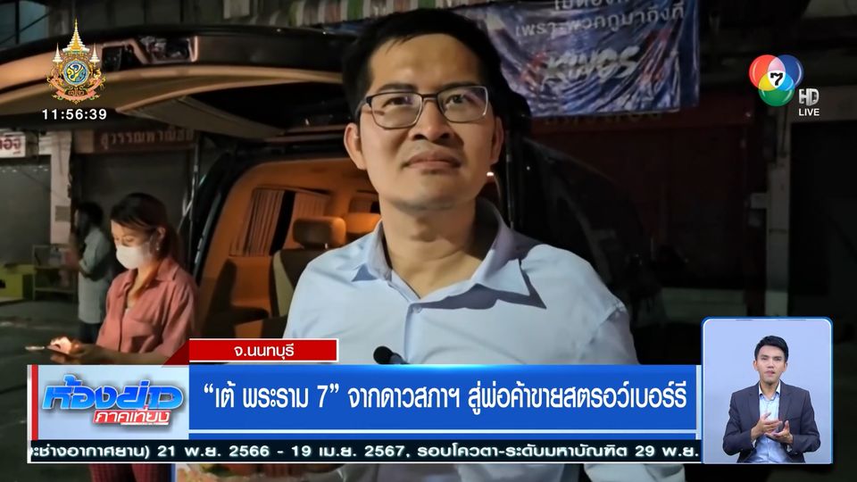 ห้องข่าวภาคเที่ยง - ยังจำ "เต้ พระราม 7" หรือ นายมงคลกิตต์ สุขสินธารานนท์ อดีต สส.บัญชีรายชื่อ หัวหน้าพรรคไทยศรีวิไลย์ ได้หรือเปล่า ล่าสุดเมื่อคืนผู้สื่อข่าวเราไปเจอ คุณเต้ ช่วยภรรยาขายสตรอว์เบอร์รี ที่ตลาดสดท่าอิฐ จังหวัดนนทบุรี โดยใช้การเปิดท้ายรถตู้ขายสตรอว์เบอร์รี กล่องละ 30 บาท ซึ่งก็มีประชาชนไปอุดหนุนตลอดเวลา