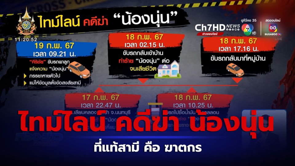 เรามาไล่เรียงไทม์ไลน์คดีนี้กันก่อน เมื่อวันที่ 19 กุมภาพันธ์ สามี คือ นายศิริชัย อายุ 33 ปี พาลูกอายุ 1 ขวบ 7 เดือน ไปแจ้งความกับตำรวจ สภ.ปากเกร็ด อ้างว่าทะเลาะกับภรรยา คือ นางสาว ชลลดา หรือ น้องนุ่น อายุ 27 ปี ก่อนภรรยาจะหนีลงจากรถไปขึ้นรถแท็กซี่หายตัวไป ติดต่อไม่ได้ ต่อมาแม่ของน้องนุ่นจะเข้าให้ข้อมูลกับตำรวจ พร้อมตั้งข้อสงสัยเกี่ยวกับคำบอกเล่าของลูกเขยหลายจุด