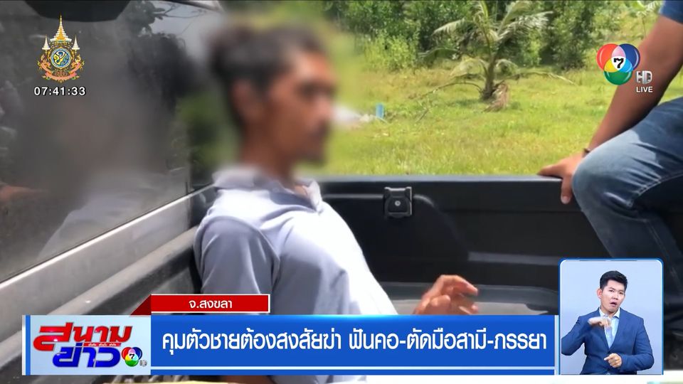 สนามข่าว 7 สี - ตำรวจควบคุมตัวชายต้องสงสัย ฆ่าฟันคอ ตัดข้อมือ 2 สามี-ภรรยา ในจังหวัดสงขลา เบื้องต้น ยังปฏิเสธข้อกล่าวหา และให้การวกวน หลังพบคราบเลือดที่ติดอยู่บนเสื้อผ้า