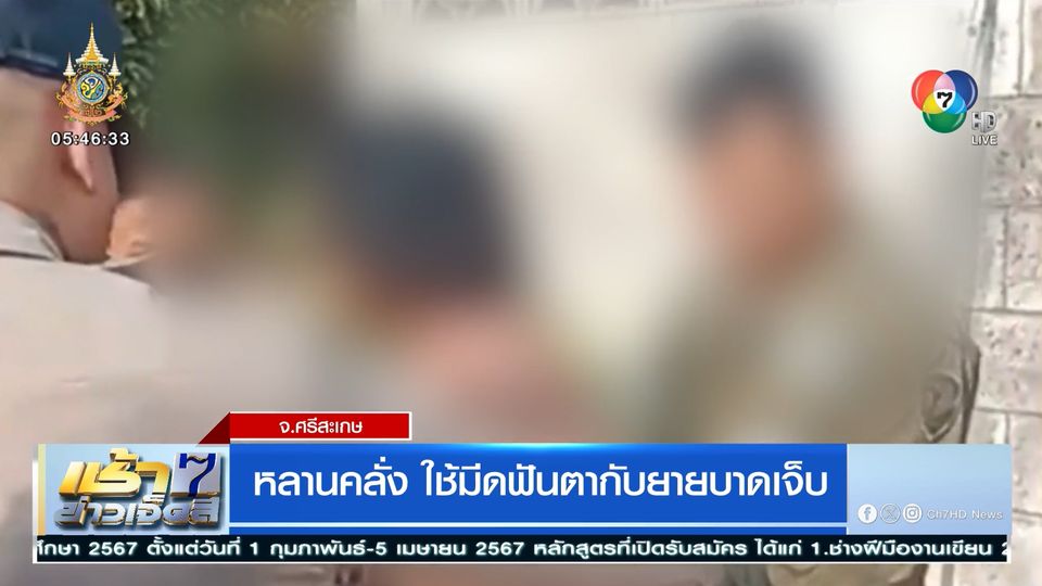 เช้าข่าว 7 สี - หลานชายคลุ้มคลั่งหลังเสพยาเสพติด ใช้มีดไล่ฟันตากับยาย จนได้รับบาดเจ็บ ก่อนวิ่งเข้าไปในวัด และเกือบเข้าไปในศูนย์พัฒนาเด็กเล็ก แต่ถูกตำรวจจับกุมตัวไว้ได้ทัน