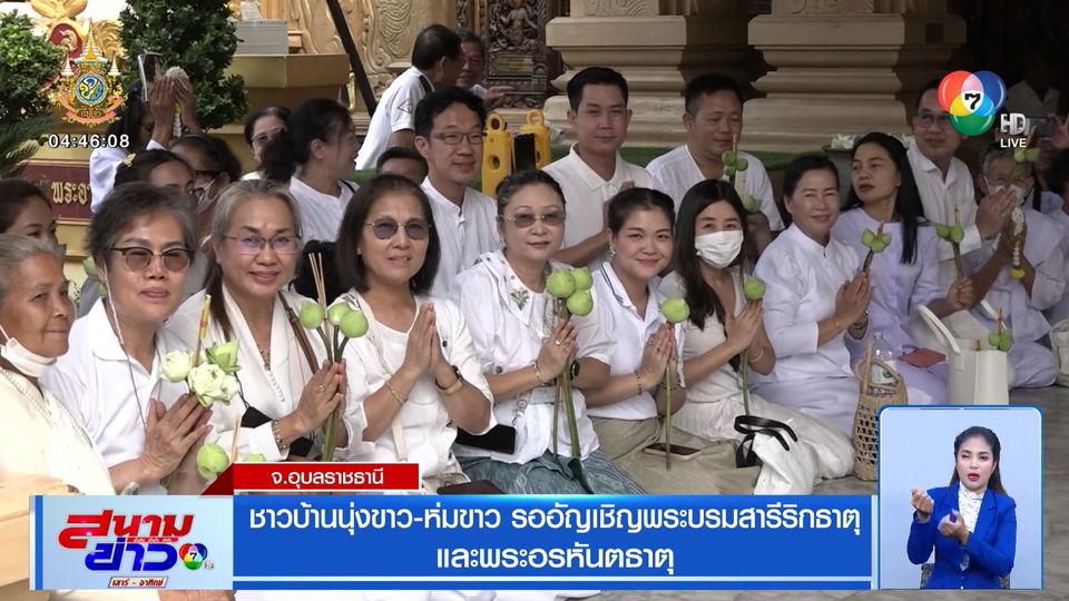 สนามข่าวเสาร์-อาทิตย์ - โดยพุทธศาสนิกชน ในจังหวัดอุบลราชธานี ต่างแต่งกายชุดขาว ห่มขาว ไปนั่งรอต้อนรับขบวนรถ ที่อัญเชิญ พระบรมสารีริกธาตุและพระอรหันตธาตุของพระสารีบุตรและพระโมคคัลลานะ หลังจากมาถึงเมื่อวานนี้ ก่อนได้ประดิษฐานที่ห้องมั่นคงภายในวิหารพระเจ้าใหญ่อินทร์แปลง วัดมหาวนาราม พระอารามหลวง