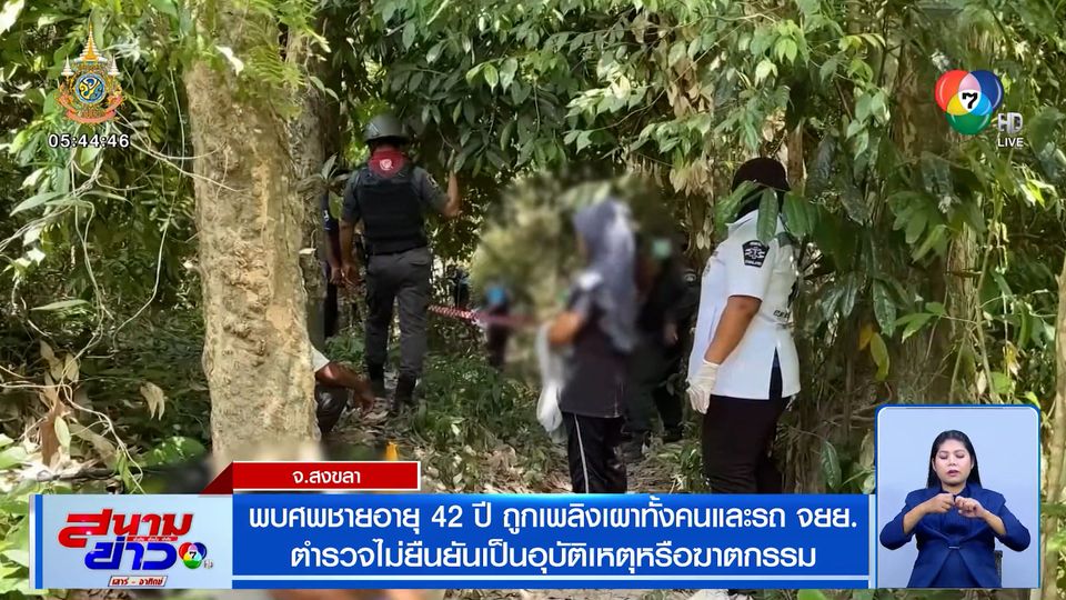 สนามข่าวเสาร์-อาทิตย์ - พบศพชายอายุ 42 ปี ถูกเพลิงเผาไหม้เกรียม ทั้งคนและรถจักรยานยนต์ ในป่าสวนยาง ตำรวจยังไม่ยืนยันสาเหตุมาจากอุบัติเหตุหรือฆาตกรรมอำพราง