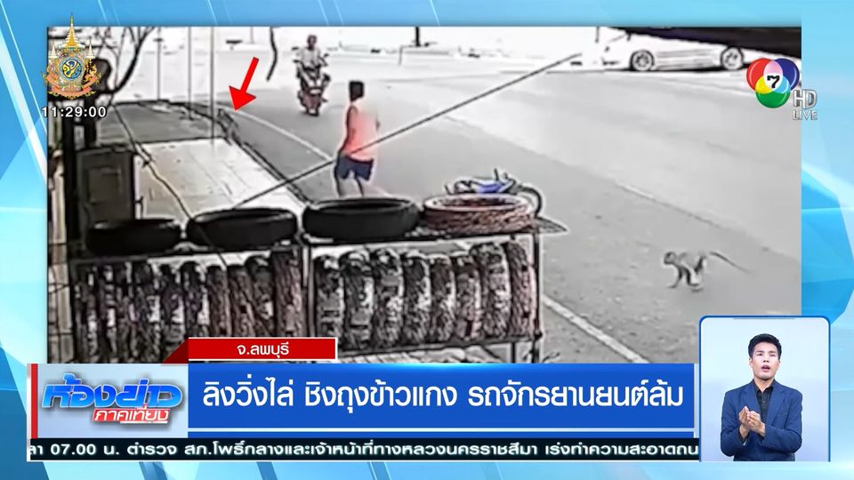 ห้องข่าวภาคเที่ยง - ลิงลพบุรี วิ่งไล่ กระโดดแย่งถุงอาหาร ถุงกับข้าว เป็นเหตุให้ผู้ขับขี่รถจักรยานยนต์ล้ม บาดเจ็บเล็กน้อย แต่ไม่ถือโทษโกรธลิง เข้าใจว่าลิงหิว