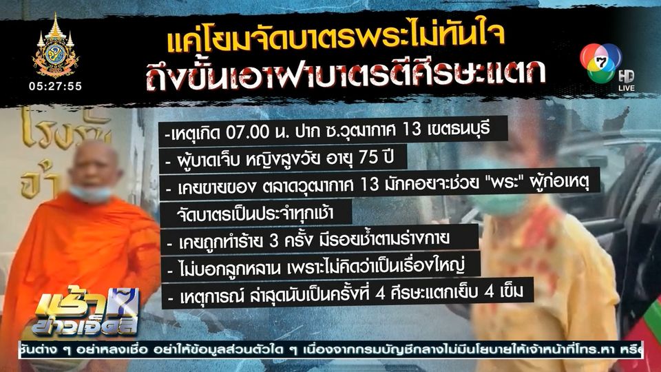 เช้าข่าว 7 สี - ความคืบหน้าเหตุการณ์ที่อาม่าถูกพระภิกษุรูปหนึ่งใช้ฝาบาตรตีศีรษะ ล่าสุดทราบว่าพระภิกษุรูปดังกล่าว หลบหนีออกจากวัดไปแล้ว