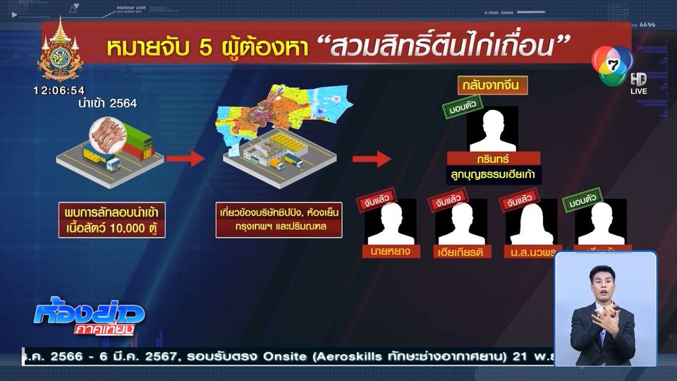 ห้องข่าวภาคเที่ยง - "กรินทร์" ลูกบุญธรรมของเฮียเก้า ผู้ต้องหาคนสุดท้ายคดีสวมสิทธิ์ตีนไก่เถื่อน ตัดสินใจเดินทางกลับมาไทยเพื่อสู้คดีแล้ว