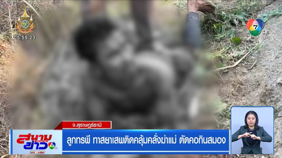 สนามข่าวเสาร์-อาทิตย์ - ข่าวนี้ต้องบอกว่า สลดอย่างมาก และเป็นผลมาจากทาสของยาเสพติดอีกแล้ว เมื่อชายอายุ 32 ปี ชาวอำเภอเวียงสระ จังหวัดสุราษฎร์ธานี คลุ้มคลั่ง คว้ามีดพร้าฟันแม่อายุ 72 ปี แล้วตัดศีรษะ เดินหนีไปในสวนปาล์มน้ำมัน พร้อมกับกินสมอง เจ้าหน้าที่ต้องระดมกำลังปิดล้อม ก่อนจับตัวได้