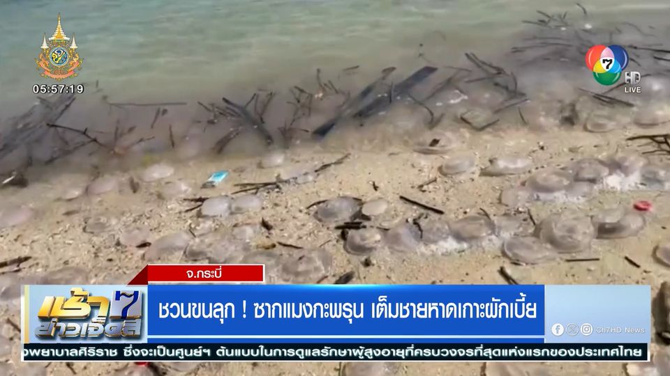 เช้าข่าว 7 สี - ช่วงนี้อันดามันคลื่นลมแรง ซัดแมงกะพรุนลอดช่อง เข้ามาจำนวนมาก ทั้งที่เกาะผักเบี้ย เกาะห้อง จังหวัดกระบี่ และยังมีซากเต็มชายหาด แม้ว่าแมงกะพรุนชนิดนี้ไม่มีพิษ แต่เจ้าหน้าที่ก็เตือนอย่าไปจับ เพราะบางคนอาจเกิดอาการแพ้ได้