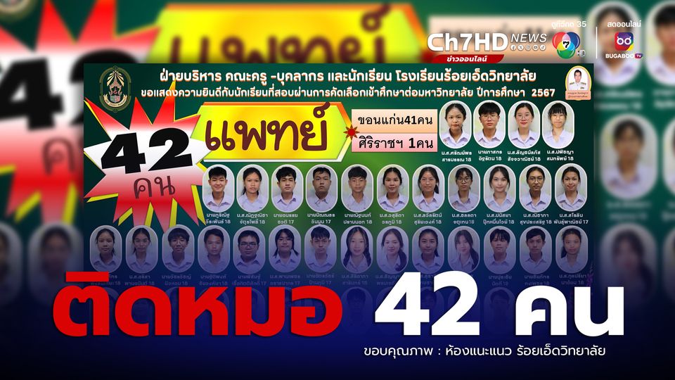 โดยข้อความบนป้ายแสดงความยินดี ระบุว่า “ฝ่ายบริหาร คณะครู – บุคลากร และนักเรียน โรงเรียนร้อยเอ็ดวิทยาลัย ขอแสดงความยินดีกับนักเรียนที่สอบผ่านการคัดเลือกเข้าศึกษาต่อมหาวิทยาลัย ปีการศึกษา 2567 รวม 42 คน แพทย์ ขอนแก่น 41 คน ศิริราชฯ 1 คน ข้อมูล ณ วันที่ 1 เม.ย.67 โรงเรียนร้อยเอ็ด วิทยาลัย”