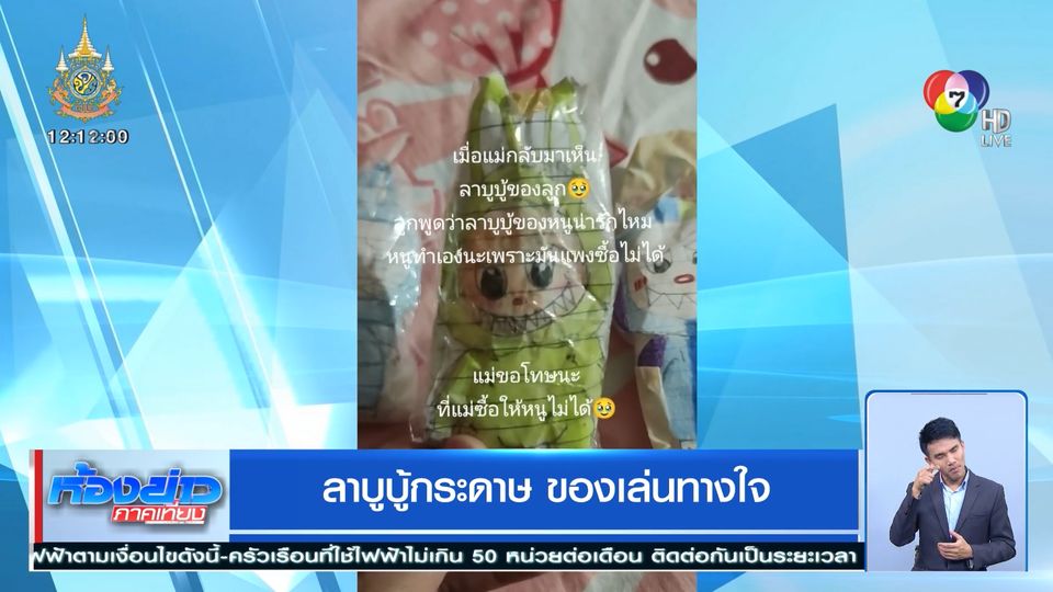 ห้องข่าวภาคเที่ยง - เจ้า "ลาบูบู้" ตุ๊กตายอดฮิต หลายคนอยากจับจองเป็นเจ้าของ แต่ราคาพุ่งสูงไปมาก มีเด็กคนหนึ่งอยากได้ แต่รู้ว่าแพงเกินไป จึงสร้างขึ้นมาเป็นลาบูบู้กระดาษ