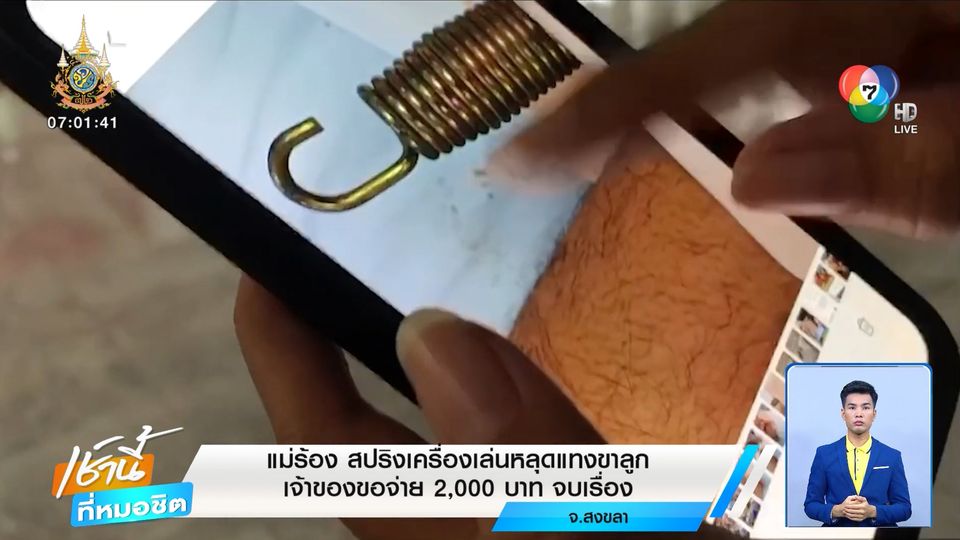 เช้านี้ที่หมอชิต - เด็กชายอายุ 14 ปี ไปเล่นแทรมโพลีน ในงานวัด แต่ปรากฏว่าเครื่องเล่นชำรุด สปริงเครื่องเล่นเกี่ยวติดบริเวณตาตุ่มอย่างน่าหวาดเสียว ปรากฏว่าเจ้าของเครื่องเล่นจ่ายเงิน 2,000 บาท พยายามขอยุติเรื่อง ก่อนรีบเก็บของหนีออกจากวัด