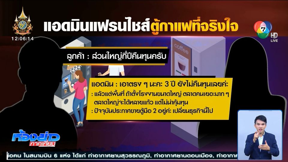 ห้องข่าวภาคเที่ยง - หนุ่มคนหนึ่งทักไลน์อยากจะซื้อแฟรนไชส์ตู้ขายกาแฟ (ตู้หยอดเหรียญกดกาแฟ) ก็ถามเลย แอดมิน "กี่ปีคืนทุน" แอดมินตอบกลับ แบบได้ใจมาก ๆ "เอาตรง ๆ นะ 3 ปีก็ยังไม่คืนทุน"