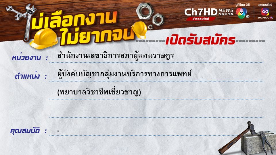 สำนักงานเลขาธิการสภาผู้แทนราษฎร มีความประสงค์ขยายการรับสมัครคัดเลือก ข้าราชการเพื่อรับโอนมาบรรจุเป็นข้าราชการรัฐสภาสามัญ ตำแหน่งผู้บังคับบัญชากลุ่มงานบริการ ทางการแพทย์ (พยาบาลวิชาชีพเชี่ยวชาญ) สำนักบริการทางการแพทย์ประจำรัฐสภา ระหว่าง วันที่ ๑ - ๑๖ พฤษภาคม ๒๕๖๗