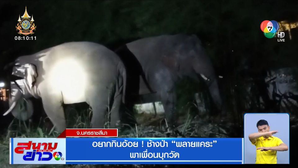 สนามข่าว 7 สี - มาอีกแล้ว "พลายแคระ" ช้างป่าเขาใหญ่ แต่คราวนี้ไม่ได้มาเพียงแค่ตัวเดียว ชวนเพื่อนรัก "พลายยอดชาย" มาด้วย ก่อนที่จะบุกเข้าไปในวัด โดยไม่สนรูปปั้นช้างที่วางไว้ขู่ช้างป่า แล้วกินอ้อยที่พระปลูกไว้ประกอบกองกฐินอย่างเอร็ดอร่อย