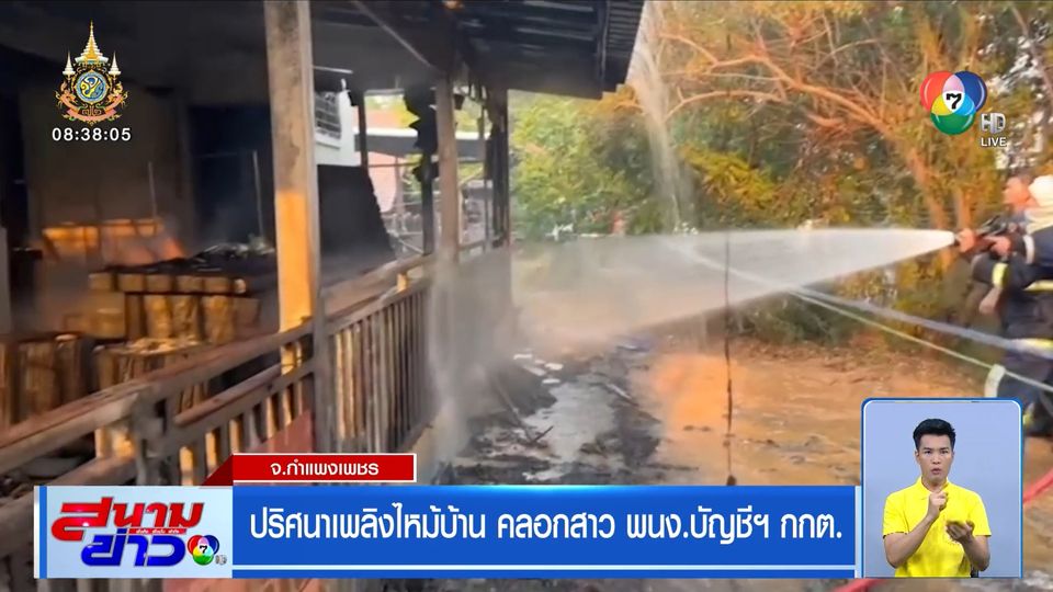 ภาพขณะไฟลุกไหม้รุนแรง บริเวณบ้าน 2 ชั้น อำเภอเมือง จังหวัดกำแพงเพชร มีรั้วรอบขอบชิด เจ้าหน้าที่ระดมฉีดน้ำ 1 ชั่วโมง เพลิงสงบ ตรวจสอบข้าวของในบ้านถูกไฟไหม้ทั้งหมด