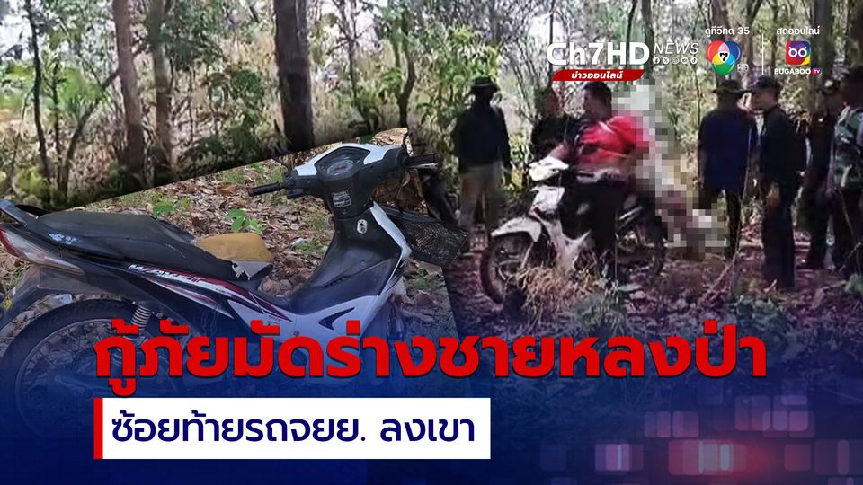 สลดชายหาของป่า จอดรถจยย.ทิ้งไว้หลายวัน ชาวบ้านแจ้งกู้ภัยฯ ออกตามหา พบเป็นศพกลางป่าลึก กู้ภัยช่วยกันลำเลียงศพกลับเข้าหมู่บ้าน ด้วยวิธีแบกหาม จับมัดนั่งซ้อนท้ายจยย.ขี่ลงเขา