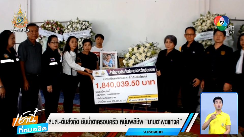 ต่อมา เรืออากาศเอกหญิง ศุภพร อยู่วัฒนา ผู้ตรวจราชการกรม สำนักงานประกันสังคม และนายพรชัย พินิจรัตนอนันต์ ประกันสังคมจังหวัดเชียงราย ได้เดินทางมามอบเงินทดแทนและสิทธิประโยชน์จากสำนักงานประกันสังคมให้กับครอบครัวผู้เสียชีวิต โดยแบ่งเป็นเงินทดแทน 1,680,000 บาท ค่าทำศพ 50,000 บาท และบำเหน็จชราภาพ 110,039.50 บาท รวมเป็นเงินทั้งสิ้น 1,840,039.50 บาท