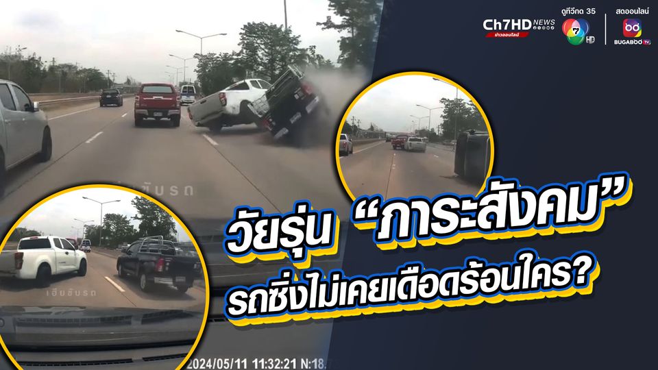 จากนั้นได้มีกระบะ 3 คัน ซึ่งแต่ละคันไม่ติดป้ายทะเบียน ขับกันมาด้วยความเร็ว อยู่บริเวณเลนซ้ายสุด ก่อนที่คันแรกจะขับเลย แต่ 2 คันหลังเกิดเสียหลัก ทำให้คันที่ 3 เฉี่ยวชน เข้ากับรถเจ้าของคลิป ส่วนคันที่ 2 เสียหลักไปชนกับกระบะคันสีดำ ที่ขับอยู่เลนขวาสุด แล้วก็มาชนเข้ากับกระบะคันสีแดง ที่วิ่งนำหน้าเจ้าของคลิปจนได้รับความเสียหาย