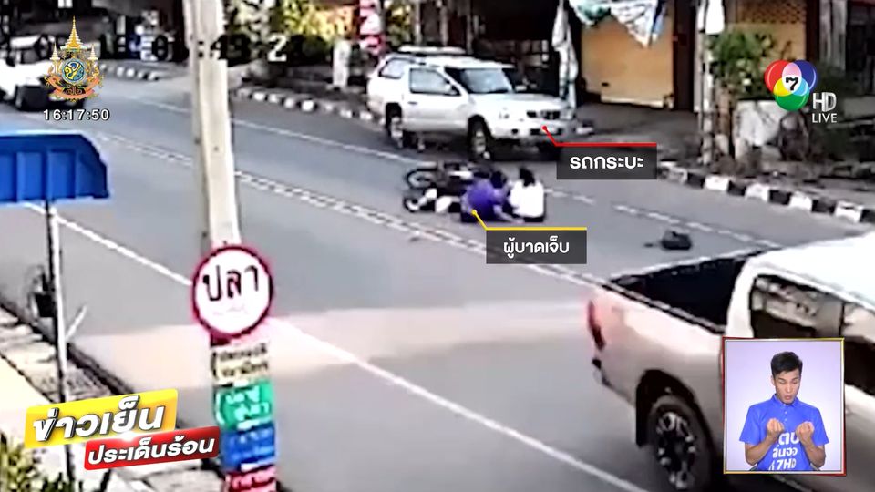 ข่าวเย็นประเด็นร้อน - แม่พาลูกขี่รถจักรยานยนต์ไปส่งโรงเรียน ระหว่างทางเจอรถกระบะเปิดประตูไม่มองหลัง ชนรถจักรยานยนต์เต็ม ๆ หวุดหวิดเกือบถูกรถคันอื่นเหยียบซ้ำ