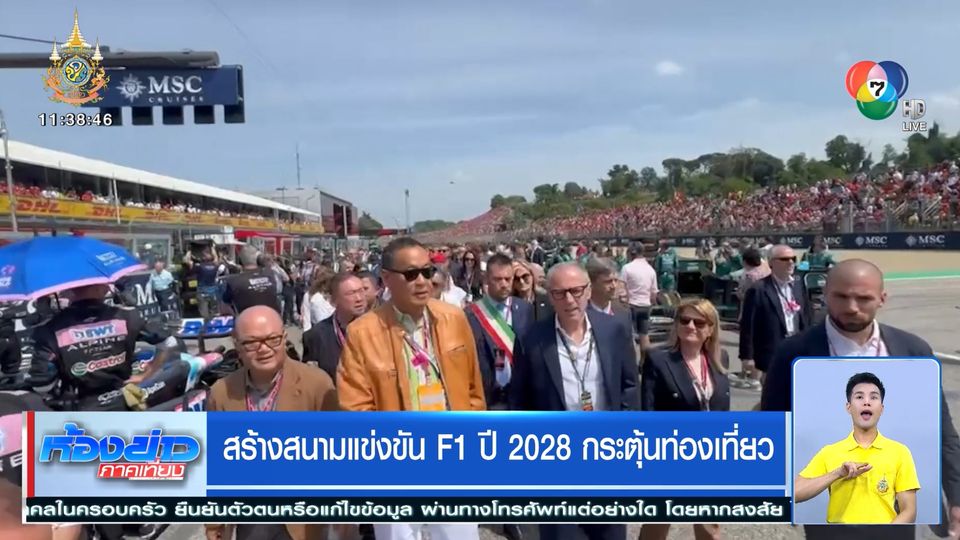 ห้องข่าวภาคเที่ยง - นายกรัฐมนตรี เผย ประเทศไทยอาจมีข่าวดี จัดการแข่งรถฟอร์มูล่าวัน เล็งใช้พื้นที่ใกล้สนามบินอู่ตะเภา เป็นสนามแข่ง พร้อมเดินหน้าเชิญนักธุรกิจชาวอิตาลีเข้ามาลงทุนในไทย