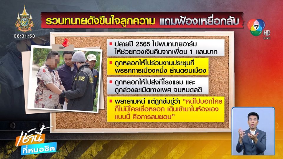 เช้านี้ที่หมอชิต - ที่จังหวัดสงขลา ตำรวจนครบาลบุกรวบทนายชื่อดัง ก่อเหตุล่วงละเมิดทางเพศลูกความ จนผู้เสียหายจิตตก กระโดดน้ำหวังจบชีวิต ด้านทนายยังไปฟ้องเหยื่อกลับ ฐานกรรโชกทรัพย์ และแจ้งความเท็จ