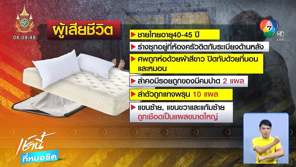 เมื่อช่วงเวลา 22.00 น.คืนที่ผ่านมา (26 พ.ค.) ตำรวจ สภ.เมืองนนทบุรี รับแจ้งมีกลิ่นเหม็นเน่าออกมาจากห้องเลขที่ 107/129 ชั้น 6 คอนโดมิเนียมแห่งหนึ่ง ในซอยงามวงศ์วาน 6 แยก 21 ตำบลบางเขน อำเภอเมืองนนทบุรี เจ้าหน้าที่ผู้เกี่ยวข้องรีบไปตรวจสอบ ที่เกิดเหตุเป็นอาคาร สูง 8 ชั้น ที่ห้องดังกล่าวพบร่างผู้เสียชีวิตเป็นชายอายุประมาณ 40-45 ปี ซุกอยู่ที่ห้องครัวติดกับระเบียงด้านหลัง สภาพศพถูกห่อด้วยผ้าสีขาว ปิดทับด้วยที่นอนและหมอน ที่ลำคอมีรอยถูกของมีคมปาด 2 แผล ตามลำตัวถูกแทงพรุน 10 แผล แขนซ้ายและแขนขวาถูกเชือดเป็นแผลขนาดใหญ่ รวมทั้งที่แก้มด้านซ้าย